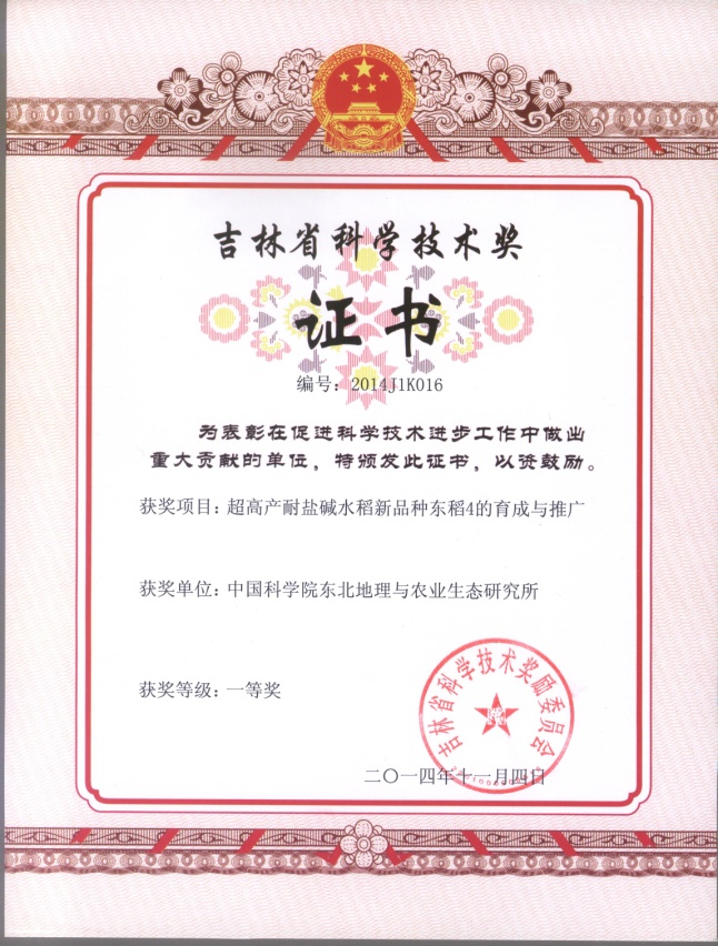 重點(diǎn)培育三“蘇打鹽堿地高效治理關(guān)鍵技術(shù)與示范”的成果采用地理遠(yuǎn)緣雜交、穿梭育種等先進(jìn)育種技術(shù),歷時(shí)16年成功育成東稻4號(hào)水稻新品種。該品種集高產(chǎn)、優(yōu)質(zhì)、多抗、理想株型及廣適性于一體,尤其是耐鹽堿性和抗稻瘟病性,均明顯優(yōu)于吉林省其他主推品種;2010年獲吉林省水稻新品種高產(chǎn)競賽一等獎(jiǎng),畝產(chǎn)849.37公斤,創(chuàng)吉林省歷史最高紀(jì)錄;2011年獲全國優(yōu)質(zhì)食味粳稻品評(píng)一等獎(jiǎng)。東稻4已成為吉林省中早至中熟的主推品種,2010-2014年東稻4在吉林省累計(jì)種植面積達(dá)367萬畝,在全國其他適宜地區(qū)推廣170萬畝,社會(huì)經(jīng)濟(jì)效益極其顯著。該成果為水稻育種親本應(yīng)用、育種方法和鑒定技術(shù)的改進(jìn)提高奠定了基礎(chǔ),對(duì)推動(dòng)吉林省水稻生產(chǎn)發(fā)展,保證國家糧食安全具有重要作用。