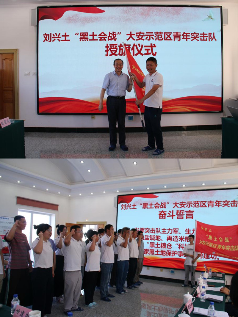 座談會(huì)上舉辦了以老科學(xué)家命名的突擊隊(duì)授旗儀式。文波龍副研究員簡(jiǎn)要介紹劉興土院士先進(jìn)事跡,李和風(fēng)向劉興土“黑土?xí)?zhàn)”大安示范區(qū)青年突擊隊(duì)授旗,青年突擊隊(duì)進(jìn)行奮斗誓言宣誓,錚錚誓言,體現(xiàn)了新一代的科研工作者以老科學(xué)家精神為引領(lǐng),緊密圍繞國(guó)家重大戰(zhàn)略需求奮勇建功的信心和決心。