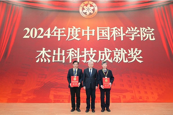 侯建國(guó)為獲得2024年度中國(guó)科學(xué)院杰出科技成就獎(jiǎng)個(gè)人成就獎(jiǎng)的陳立泉院士、陳仙輝院士頒獎(jiǎng)