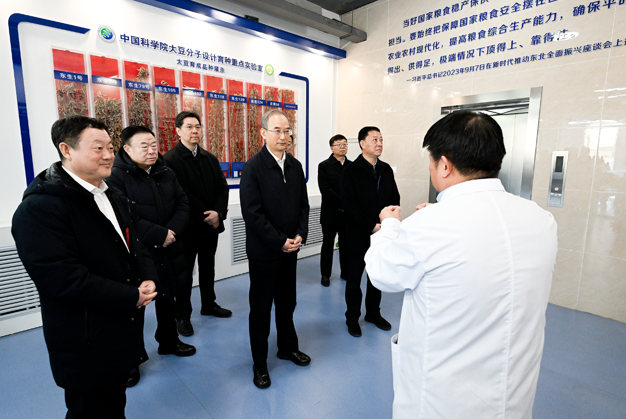 黃強(qiáng)、胡玉亭首先來(lái)到研究所所史館,詳細(xì)了解了歷史沿革,學(xué)科布局、科技任務(wù)、平臺(tái)建設(shè)、人才隊(duì)伍以及濕地生態(tài)保護(hù)等方面的內(nèi)容,并與一線科研人員親切交流,仔細(xì)詢問(wèn)科研項(xiàng)目進(jìn)展,鼓勵(lì)他們把論文寫(xiě)在吉林大地上。在“黑土糧倉(cāng)”科技會(huì)戰(zhàn)指揮中心,黃強(qiáng)、胡玉亭觀看了“黑土糧倉(cāng)”科技會(huì)戰(zhàn)指揮系統(tǒng)演示和黑土地保護(hù)利用科研工作情況。黃強(qiáng)強(qiáng)調(diào),要在推廣“梨樹(shù)模式”上多下功夫,用科技力量守護(hù)好“黑土糧倉(cāng)”。隨后,黃強(qiáng)、胡玉亭走進(jìn)東北亞種質(zhì)資源綜合研究中心,實(shí)地察看大豆分子設(shè)計(jì)育種體系建設(shè)、系列大豆新品種、大豆育種芯片研發(fā)等工作進(jìn)展,希望持續(xù)抓好種業(yè)科技攻關(guān),把種子這一農(nóng)業(yè)“芯片”牢牢掌握在自己手中。