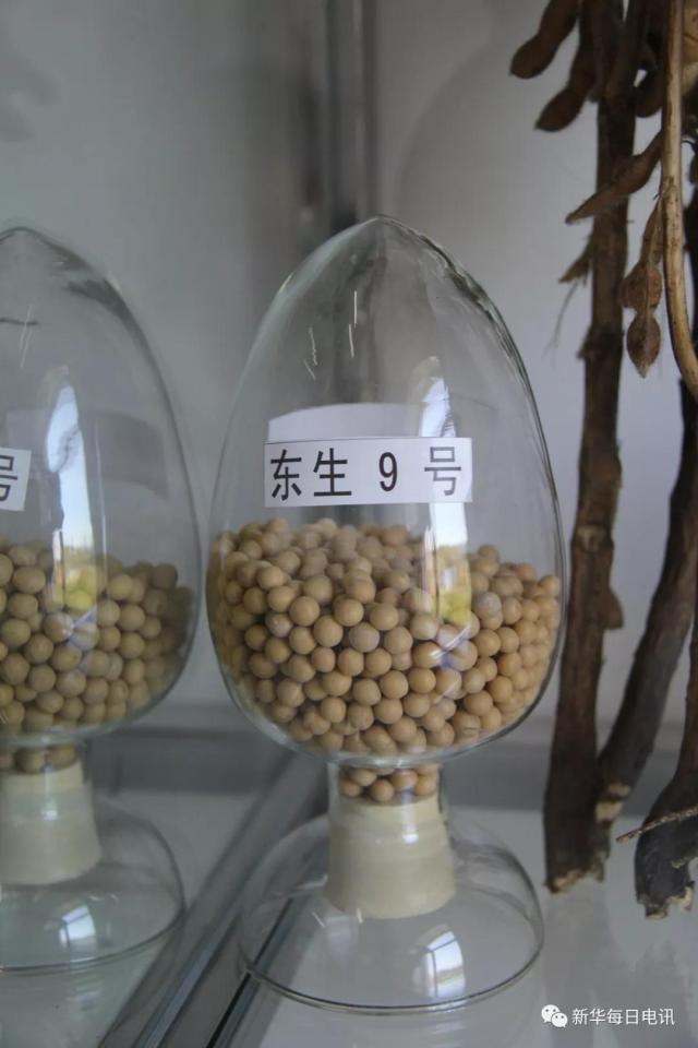 在實(shí)驗(yàn)站內(nèi)一間實(shí)驗(yàn)室里,擺滿了掛著密密麻麻豆莢的大豆秧,有的放在玻璃罩內(nèi);另一間實(shí)驗(yàn)室的架子上,一層層放滿了一袋袋用小網(wǎng)兜裝起來的大豆種子。