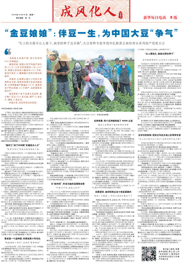 新華社北京10月15日電(記者謝銳佳、管建濤、楊喆)10月15日,《新華每日電訊》刊載題為《“金豆娘娘”:伴豆一生,為中國(guó)大豆“爭(zhēng)氣”——“天上的火箭不讓人落下,地里的種子也不能”,大豆育種專家李艷華扎根黑土地培育出系列高產(chǎn)優(yōu)質(zhì)大豆》的報(bào)道。