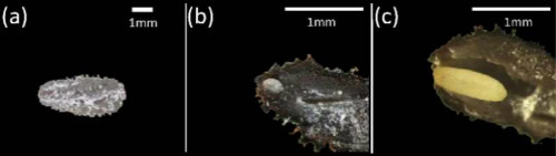 圖2 Anigozanthos flavidus種子萌發(fā)過(guò)程中胚的變化動(dòng)態(tài)(a)完整的種子, (b)萌動(dòng)前的胚, (c) 萌發(fā)前伸長(zhǎng)的胚