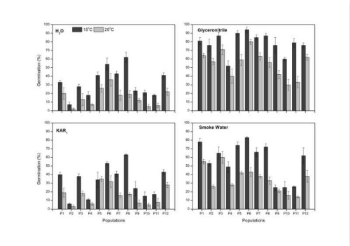 近年來(lái),馬紅媛與澳大利亞多家單位的專家合作,對(duì)澳大利亞不同休眠類型植物Boronia floribunda(物理休眠)和Anigozanthos flavidus(形態(tài)生理休眠)的種子開展了系統(tǒng)研究,深入剖析了種子在個(gè)體和種群水平上,KAR1、SP1、煙水、熱激及其互作等對(duì)種子休眠和萌發(fā)、胚生長(zhǎng)動(dòng)態(tài)等的影響。研究表明,Boronia floribunda種子在個(gè)體水平上對(duì)煙水的濃度存在顯著差異,保證了部分種子能夠在適宜的環(huán)境下快速萌發(fā);而部分種子則保持休眠狀態(tài)并形成土壤種子庫(kù),這種趨同進(jìn)化保證了該物種在火燒生態(tài)系統(tǒng)中的保存和更新(圖1)。同時(shí),通過(guò)對(duì)比12個(gè)種群的種子萌發(fā)特性(圖2),首次報(bào)道了Anigozanthos flavidus種子休眠程度存在的種群水平顯著差異,揭示了深度和淺度休眠差異的種子對(duì)不同煙信號(hào)及其互作的顯著差異性響應(yīng)特征(圖3),總結(jié)了該物種適應(yīng)火燒及多變復(fù)雜生境的重要繁殖策略。