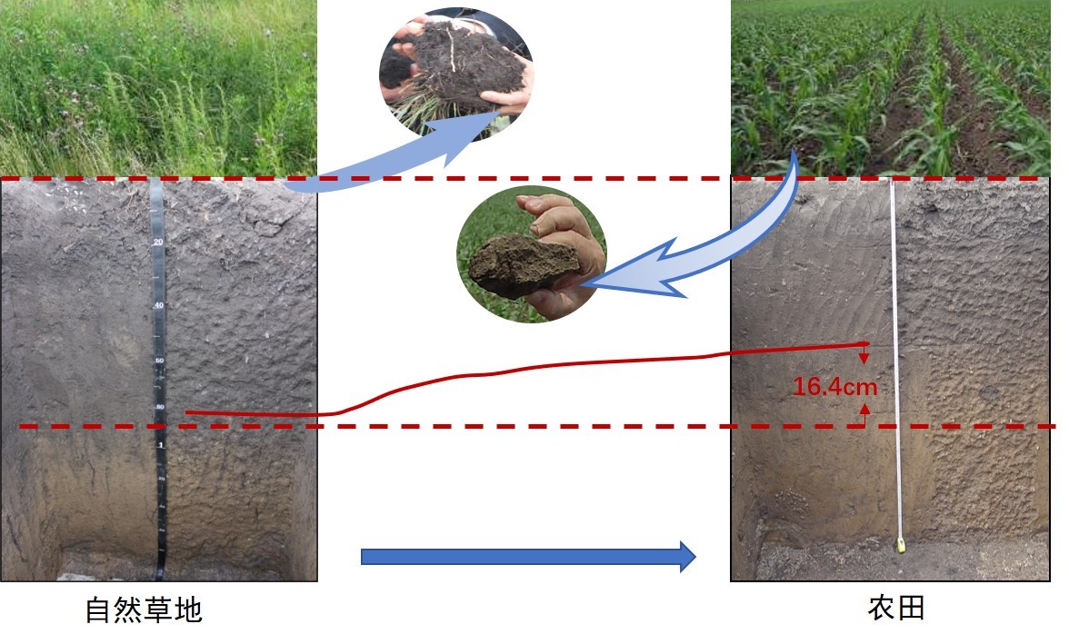 自然草地與農(nóng)田黑土層對(duì)比。