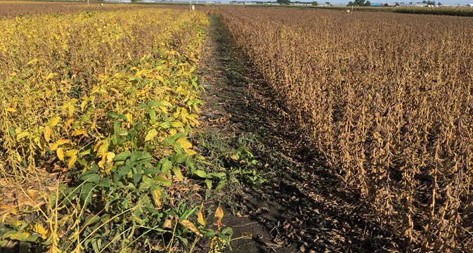 應(yīng)用黑土地保護(hù)利用技術(shù)的大豆正常成熟(右)。