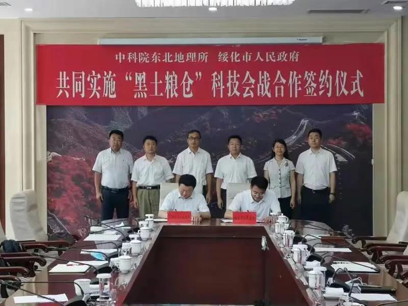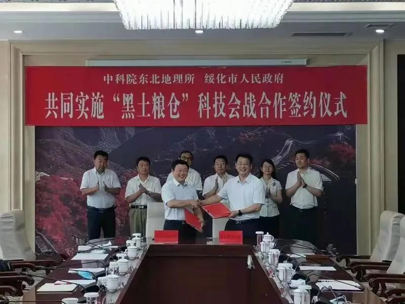 隨后,在孫恒義等領(lǐng)導(dǎo)和中科院東北地理所相關(guān)同志的共同見證下,孫飚代表綏化市人民政府與姜明所長正式簽訂共同實施“黑土糧倉”科技會戰(zhàn)合作協(xié)議。