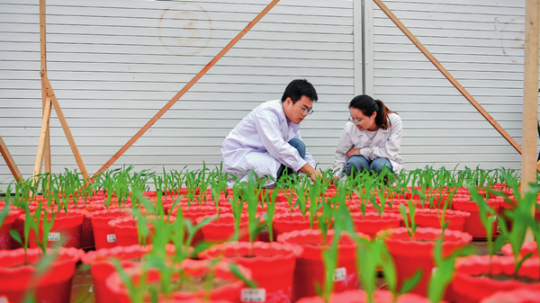 8月2日,吉林省梨樹縣四棵樹鄉(xiāng)三棵樹村“科技小院”,中國農(nóng)業(yè)大學(xué)博士研究生沙野(左)和在讀碩士郭雯清觀察玉米樣本 張楠攝 / 本刊