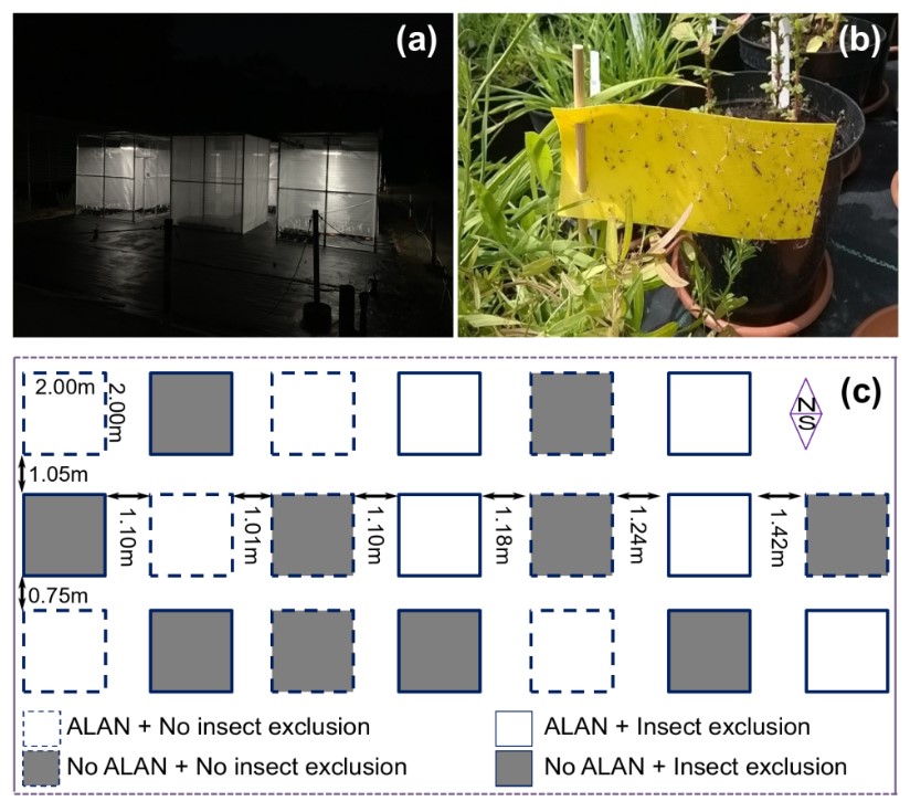 針對以上研究空白,中科院東北地理所生物入侵生態(tài)學(xué)研究團(tuán)隊劉艷杰研究員聯(lián)合德國康斯坦茨大學(xué),進(jìn)行了夜間路燈(有與無)×昆蟲排除(排除與不排除)全因子實驗,對比外來植物和本地植物中的常見種(廣幅分布且在群落中占據(jù)優(yōu)勢)與稀有種(窄幅分布且在群落中不占優(yōu)勢)對夜晚燈光和昆蟲采食的響應(yīng)特征。