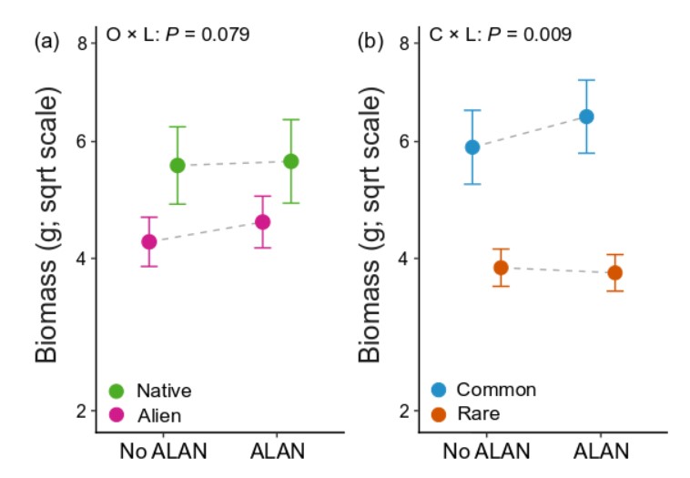 研究結(jié)果表明:夜晚燈光促進(jìn)常見種的生長,卻抑制稀有種的生長。同時,研究還發(fā)現(xiàn)夜晚燈光對外來植物生長的促進(jìn)作用強(qiáng)于本地植物。遺憾的是,研究并未發(fā)現(xiàn)地上昆蟲排除可以介導(dǎo)四組植物對夜晚燈光的響應(yīng),這可能與營養(yǎng)級的調(diào)控作用是緩慢而長期的,而模擬實驗周期卻較短有關(guān)。本研究首次揭示了未來光污染可能在植物群落構(gòu)建中發(fā)揮重要作用,它不僅可能促進(jìn)外來植物對本地群落的入侵,還可能加劇本地群落內(nèi)常見種對稀有物種的競爭排斥。