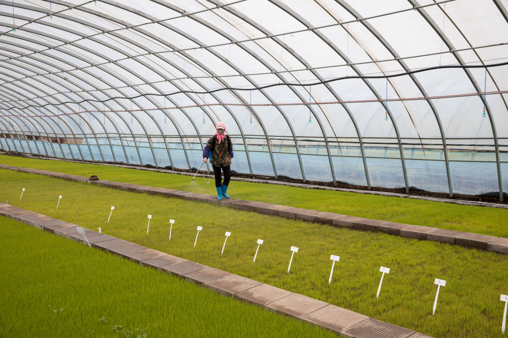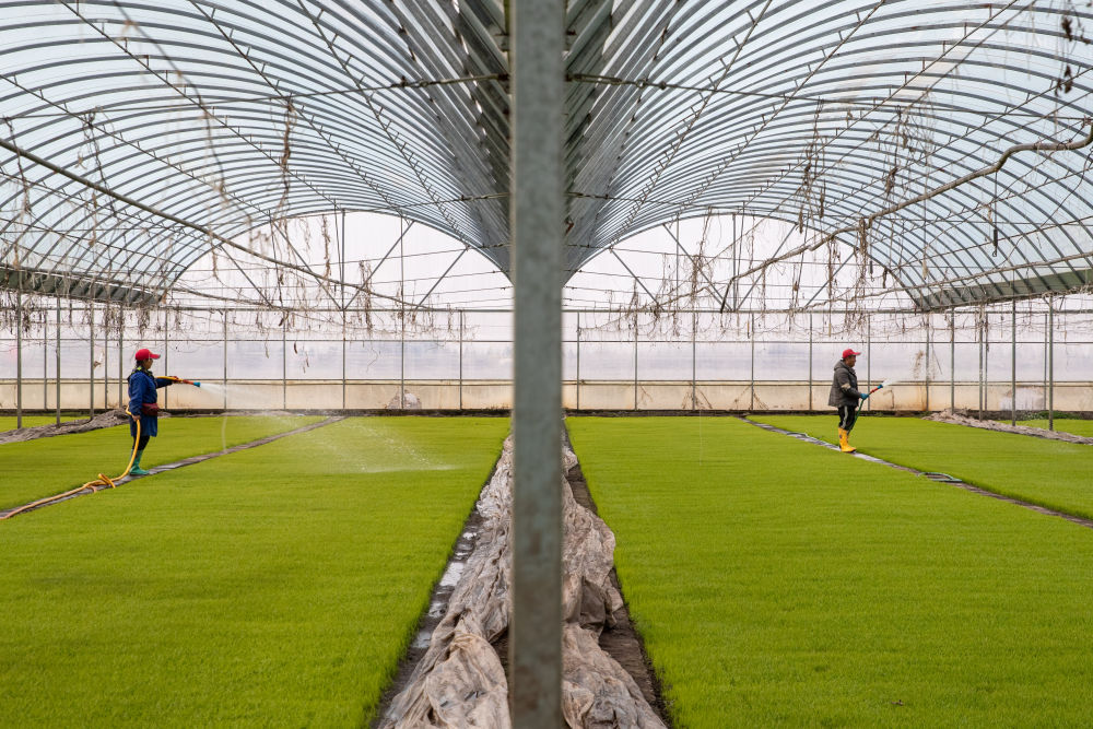 在黑龍江省慶安縣東禾久宏現(xiàn)代農(nóng)業(yè)水稻示范園區(qū)育秧大棚內(nèi),農(nóng)民在進(jìn)行秧苗養(yǎng)護(hù)(4月26日攝)。新華社記者 張濤 攝