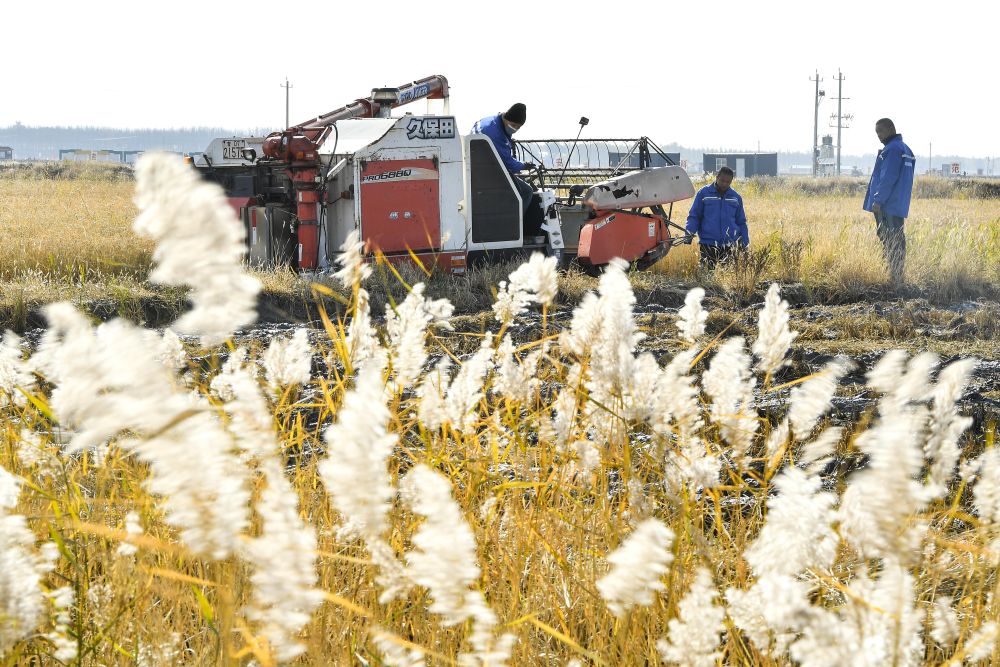在大安市海坨鄉(xiāng)鹽堿地生態(tài)修復治理示范基地,農民駕駛收割機收割水稻(2022年10月12日攝)。新華社記者 許暢 攝