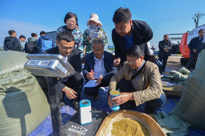 2020 年 9 月 27 日,專(zhuān)家和工作人員在內(nèi)蒙古興安盟袁隆平院士工作站鹽堿地水稻基地進(jìn)行測(cè)產(chǎn),畝產(chǎn)稻谷再破千斤 徐欽 / 攝