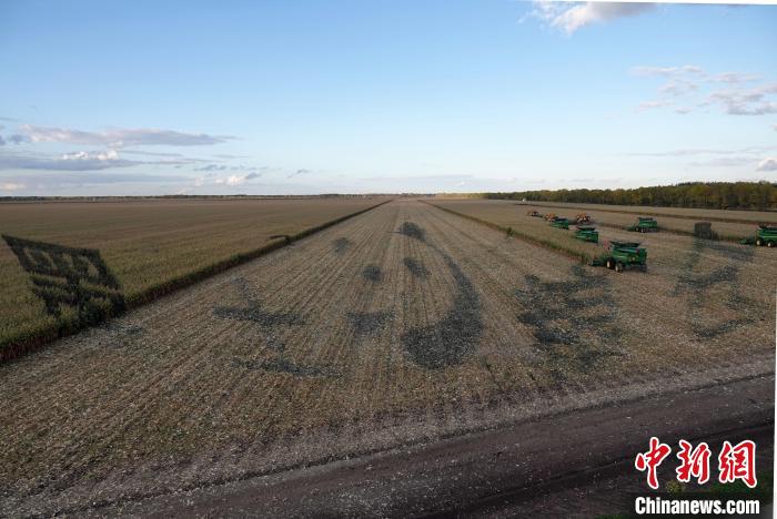 友誼農(nóng)場“萬畝大地號”上,農(nóng)機進行作物收割作業(yè),場面壯觀。中新網(wǎng)記者 孫自法 攝