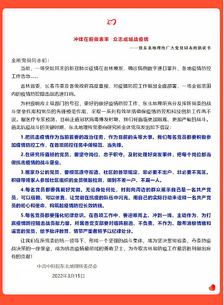 值此非常時期,東北地理所上下團結(jié)一心,持續(xù)貫徹落實上級黨組織各項決策部署。我們相信沒有一個寒冬不可逾越,沒有一個春天不會來臨,讓我們堅定信心、共克時艱,為奪取最后的勝利,奮勇向前!