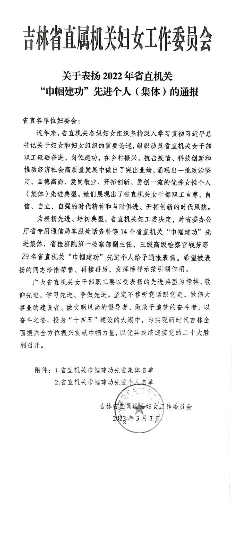 為表揚先進、培樹典型,省直機關(guān)婦工委印發(fā)《關(guān)于表揚2022年省直機關(guān)“巾幗建功”先進個人(集體)的通報》,對14個省直機關(guān)“巾幗建功”先進集體和29名省直機關(guān)“巾幗建功”先進個人給予通報表揚。東北地理與農(nóng)業(yè)生態(tài)研究所黑土有機碳與保護性耕作學(xué)科組組長、黑土區(qū)農(nóng)業(yè)生態(tài)重點實驗室副主任梁愛珍,榮獲2022年省直機關(guān)“巾幗建功”先進個人稱號。
