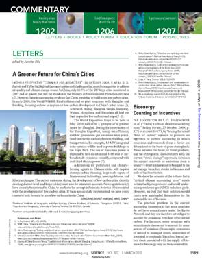 該文從環(huán)境政策與應(yīng)對(duì)氣候變化的角度出發(fā),探討了美、中科研小組發(fā)表在《SCIENCE》上的文章(2009,Vol. 326, P.674)提出的“世界特大城市污染排放與氣候變化”的問(wèn)題。論文指出,目前有足夠的證據(jù)表明,中國(guó)正在致力于建設(shè)更多的低碳城市(low-carbon cities),并用大量數(shù)據(jù)闡述了中國(guó)政府在構(gòu)建低碳城市方面所做出的努力。同時(shí)指出,為了更好地解決城市污染與氣候變化的問(wèn)題,需要在戰(zhàn)略規(guī)劃、資金和技術(shù)投入、法規(guī)制定和生活消費(fèi)方式轉(zhuǎn)變等方面開(kāi)展更多工作。