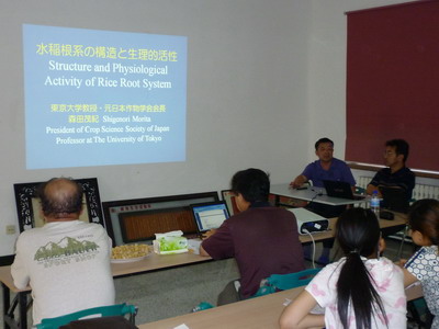 參觀結束后,在大安堿地生態(tài)試驗站三樓報告廳舉行了學術報告會。森田茂紀教授基于自己多年的研究成果做了題為《水稻根系構造與生理活性研究》的學術報告。楠谷彰人教授針對我國未來生活消費水平的提高對優(yōu)質食味米的潛在需求做了題為《水稻食味米研究》的報告。他結合自己的研究介紹了水稻食味的鑒定方法,指出蛋白質含量和直鏈淀粉含量較低的品種在味覺、香味、黏度、硬度、外觀等方面均具有均衡的表現(xiàn)。塩津文隆博士以《日本利用水稻生產(chǎn)生物乙醇的產(chǎn)量潛力估算》為題,詳細闡述了日本利用農(nóng)業(yè)棄耕地種植水稻生產(chǎn)生物乙醇的生產(chǎn)潛力,并從品種類型選擇及栽培角度提出了提高水稻生產(chǎn)生物乙醇效率的技術途徑與措施。
