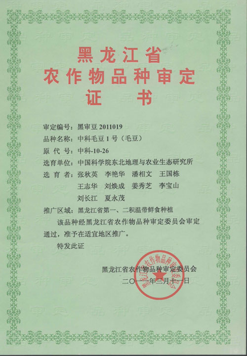 由我所張秋英研究員等經(jīng)過(guò)多年技術(shù)攻關(guān),精心選育的菜用大豆新品種“中科毛豆1號(hào)”(品種審定編號(hào):黑審豆2011019),2011年3月11日通過(guò)了“黑龍江省農(nóng)作物品種審定委員會(huì)”審定。