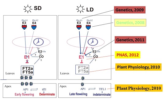 植物光周期現(xiàn)象(photoperiodism)是指植物通過感受晝夜長短而控制植株內(nèi)部生理反應(yīng)過程,其中研究較多的是植物通過感受晝夜長短變化而控制開花。大豆起源于我國,是早期研究光周期現(xiàn)象的重要模式植物。大豆生育期基因E1與大豆光周期反應(yīng)關(guān)系密切,同時(shí)對大豆的開花期及成熟期的影響最大。由于該基因位于第六染色體的近中心粒附近,其遺傳重組率極低,該基因自1971年正式定名來,長期未能揭開其神秘的面紗。夏正俊等研究者花近八年時(shí)間經(jīng)傳統(tǒng)的圖位克隆法成功地克隆了該基因,其研究論文發(fā)表在PNAS上(2012年109:E2155-64)。結(jié)果表明E1基因含有一個(gè)雙邊的(Bipartite)核定位信號(NLS),并含有一個(gè)與B3遠(yuǎn)緣相關(guān)的結(jié)構(gòu)域,為豆科作物所特有的基因序列,預(yù)示著大豆中可能存在著與水稻及擬南芥不同的光周期調(diào)控開花途徑。一位審稿專家指出:本研究對于我們認(rèn)識不同植物在調(diào)控開花上如何進(jìn)化是一個(gè)重要里程碑式的工作,展示了植物如何調(diào)控開花的一個(gè)全新的概念,因而引發(fā)人們的普遍及濃厚的興趣。加拿大Cober教授評述說,E1基因的克隆不僅對于對光周期理論意義重大,使育種有了具體的分子目標(biāo)。我國大豆產(chǎn)業(yè)體系首席專家韓天富評價(jià):E1基因的成功克隆是我國科學(xué)家對大豆光周期的重要貢獻(xiàn)。