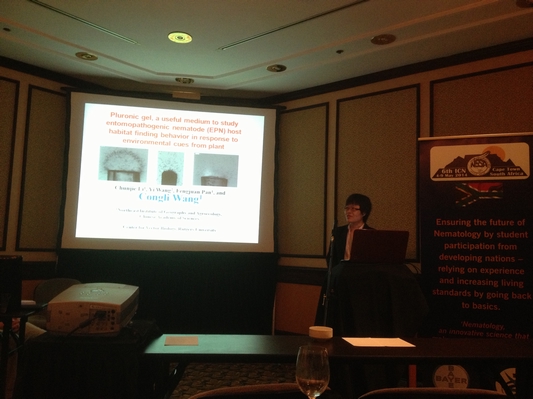 王從麗研究員提交的兩個摘要均被選上做分會報告,分別是“Pluronic gel, a useful medium to study entomopathogenic nematode host habitat finding behavior in response to environmental cues from plant”和“Transgressive segregation of root-knot nematode resistance in cotton determined by QTL analysis”。向線蟲界專家報告了我所在昆蟲病原線蟲領域研究取得的新進展以及棉花抗根結線蟲的超親分離遺傳機理方面的研究進展。