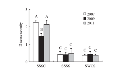 圖1 不同輪作系統(tǒng)下大豆根腐病害發(fā)生程度