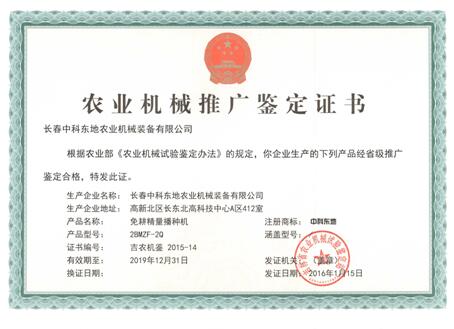 2BMZF-2Q型兩行免耕精量播種機(jī)推廣鑒定證書(shū)