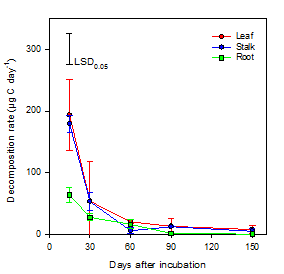 圖1 植物殘?bào)w(葉片,莖稈,根)在土壤中的腐解速率