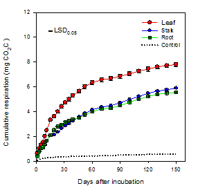 圖2 150天培養(yǎng)時(shí)間內(nèi)不同殘?bào)w加入土壤后的累加呼吸