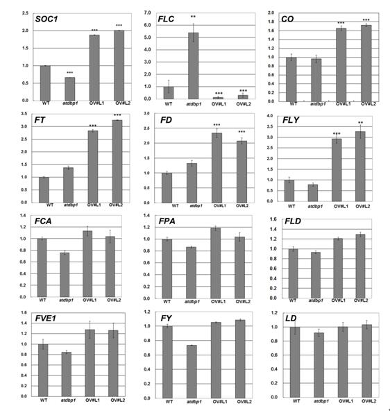 圖2. 開花途徑節(jié)點(diǎn)基因在AtDBP1過表達(dá)植株與敲除的突變體中的表達(dá)分析