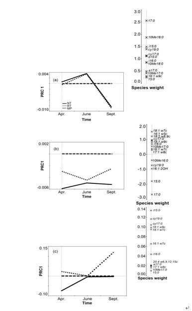 圖:不同土層處磷脂脂肪酸帶物種權(quán)重的主響應(yīng)曲