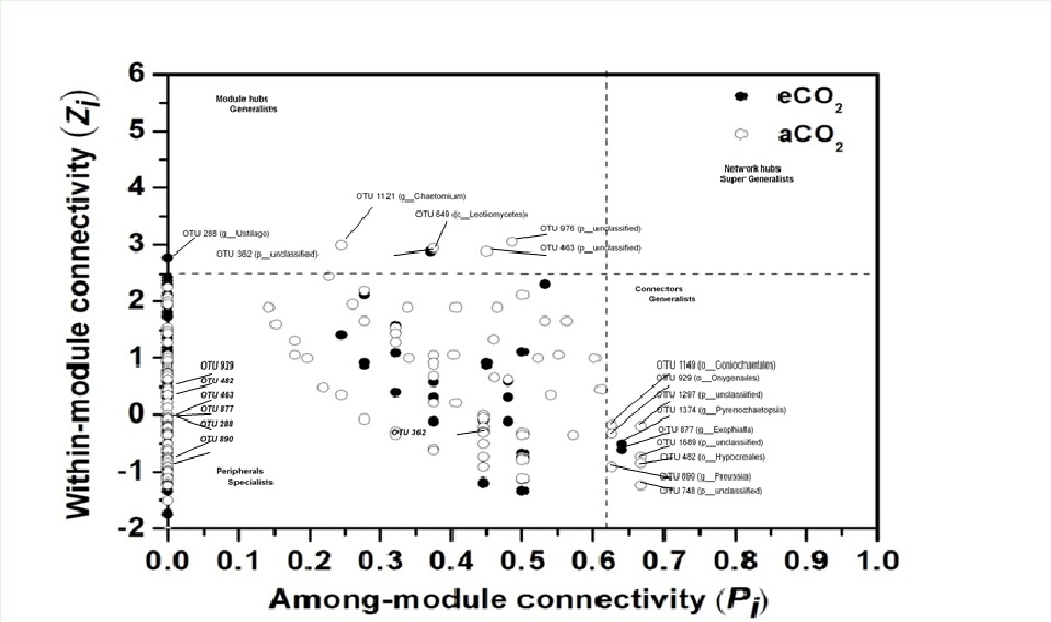 圖3 CO2濃度升高(eCO2)和不升高(aCO2)條件下不同大豆品種根際真菌群落網(wǎng)絡(luò)結(jié)構(gòu)Zi-Pi圖