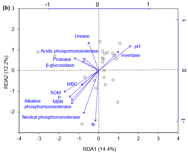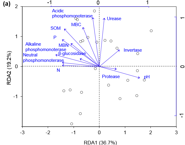 圖2 細(xì)菌(a)和真菌(b)群落結(jié)構(gòu)與土壤性質(zhì)的RDA分析