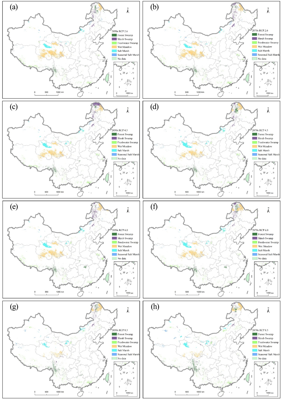 預(yù)測結(jié)果表明,未來全球增溫將進一步威脅現(xiàn)存自然濕地,高海拔山地和內(nèi)陸干旱半干旱地區(qū)的濕地生態(tài)系統(tǒng),將面臨更快速的退化風險。在各類型濕地中,淡水沼澤和季節(jié)性鹽沼面臨的風險更高。期刊審稿專家和主編評價認為該成果為認識歷史濕地分布格局,科學合理指導現(xiàn)實濕地恢復提供了依據(jù);同時,認為本研究填補了中國濕地研究缺少地質(zhì)歷史時期全國尺度分布圖的空白。