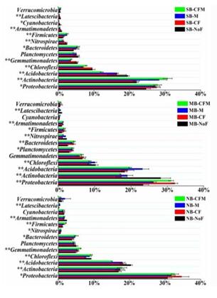 為了維持和提高農(nóng)田土壤生產(chǎn)力,向土壤中施加肥料已成為常規(guī)的農(nóng)業(yè)生產(chǎn)管理措施。國內(nèi)外許多資料表明,肥料管理對土壤微生物影響明顯,但不同區(qū)域的研究結(jié)果不盡相同。東北黑土是地帶性土壤,前期研究發(fā)現(xiàn)東北黑土農(nóng)田土壤微生物存在明顯的地理分布格局,但長期相似的施肥管理能否驅(qū)動不同地點的微生物群落結(jié)構(gòu)具有趨同性?有機肥和化肥對黑土區(qū)土壤微生物如何影響?為回答上述問題,東北地理所農(nóng)田分子生態(tài)學(xué)科組與相關(guān)單位合作,從黑土區(qū)南部公主嶺(SB)、中部哈爾濱(MB)和北部黑河(NB)3個長期定位施肥試驗站,選取4種相似的施肥制度:NoF(無肥),CF(單施化肥),M(單施有機肥)和CFM(化肥有機肥配施)的耕層土壤為研究對象,采用熒光定量PCR和Illumina Miseq高通量測序技術(shù),對比研究了長期相同施肥制度下3個地點土壤微生物豐度及群落結(jié)構(gòu)分布特征,以及長期不同施肥制度對單個地點土壤微生物豐度及群落結(jié)構(gòu)的影響。研究發(fā)現(xiàn),施用有機肥增加了黑土區(qū)土壤微生物豐度和土壤微生物量碳含量(圖1),顯著增加富營養(yǎng)型細菌和植物有益真菌的含量(圖2);而化肥的添加會導(dǎo)致潛在植物致病真菌含量的增加(圖3)。研究同時發(fā)現(xiàn)3個地點盡管經(jīng)歷了長期不同的肥料處理,但相同的施肥方式并沒有驅(qū)動土壤微生物向同質(zhì)化方向演替,地域差異仍是決定東北黑土區(qū)土壤細菌和真菌群落結(jié)構(gòu)組成的主導(dǎo)因素,長期不同施肥管理僅在局部地區(qū)對土壤微生物群落產(chǎn)生微調(diào)作用(圖4和圖5)。該研究進展進一步佐證了黑土農(nóng)田土壤微生物地理分布格局的存在,同時也表明黑土帶上“一方水土生存一方微生物”。