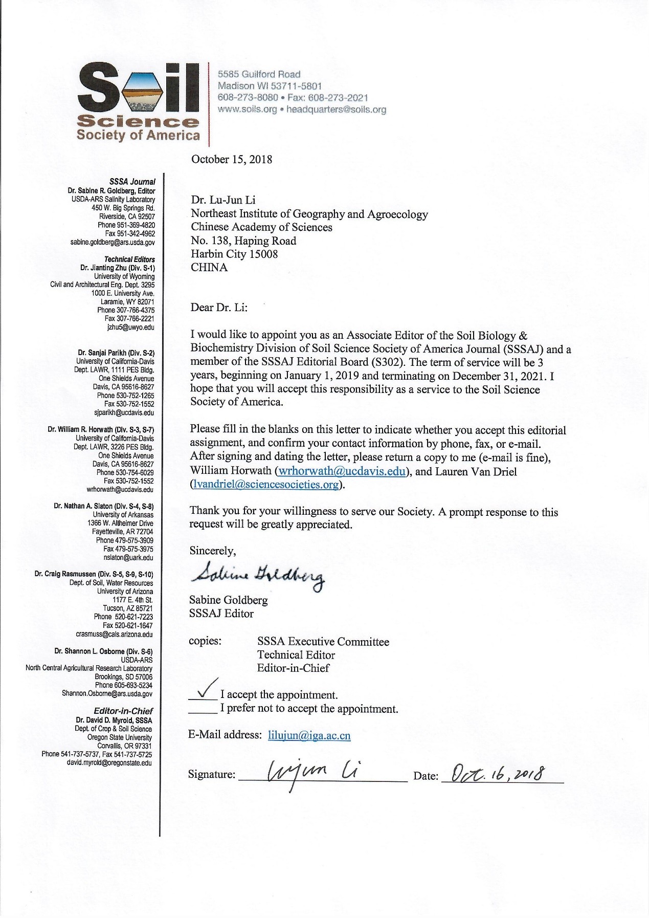 近日,中國(guó)科學(xué)院東北地理與農(nóng)業(yè)生態(tài)研究所李祿軍研究員收到了美國(guó)土壤學(xué)會(huì)會(huì)刊Soil Science Society of America Journal(SSSAJ)的正式邀請(qǐng),擔(dān)任該期刊的副主編(Associate Editor)和編委(S302),任期三年(2019年1月1日至2021年12月31日)。