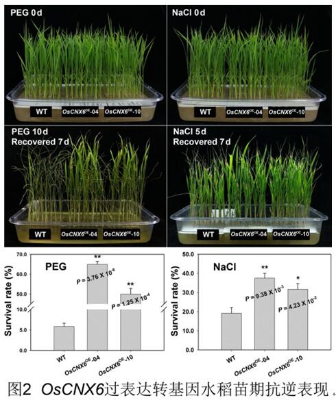 東北地理所水稻分子育種學(xué)科組方軍博士前期通過大規(guī)模的篩選,獲得一系列水稻穗發(fā)芽突變體,并克隆了其中的PHS1-PHS4 和PHS8基因(Plant J, 2008、Plant J,2018)。本次研究證明了MoCo合成基因OsCNX1 和 OsCNX6的突變最終導(dǎo)致了穗發(fā)芽及純合致死。OsCNX6 編碼MoCo合成蛋白2大亞基,該基因的突變導(dǎo)致黃嘌呤脫氫酶(XDH)、醛氧化酶(AO)、硝酸還原酶(NR)及亞硫酸鹽氧化酶(SO)等四種鉬酶活性顯著降低。通過分析基因表達(dá)模式,表明OsCNX6在水稻的葉片、莖稈、胚乳等部位均有表達(dá)。進(jìn)一步過量表達(dá)該基因的轉(zhuǎn)基因水稻沒有出現(xiàn)不利的農(nóng)藝性狀,而植株對滲透和鹽脅迫的抗性有了顯著提高。這一研究不僅揭示了MoCo合成基因?qū)λ旧L發(fā)育的重要作用,同時也為水稻抗逆育種提供了新的研究思路和視角,具有重要的理論和應(yīng)用價值。