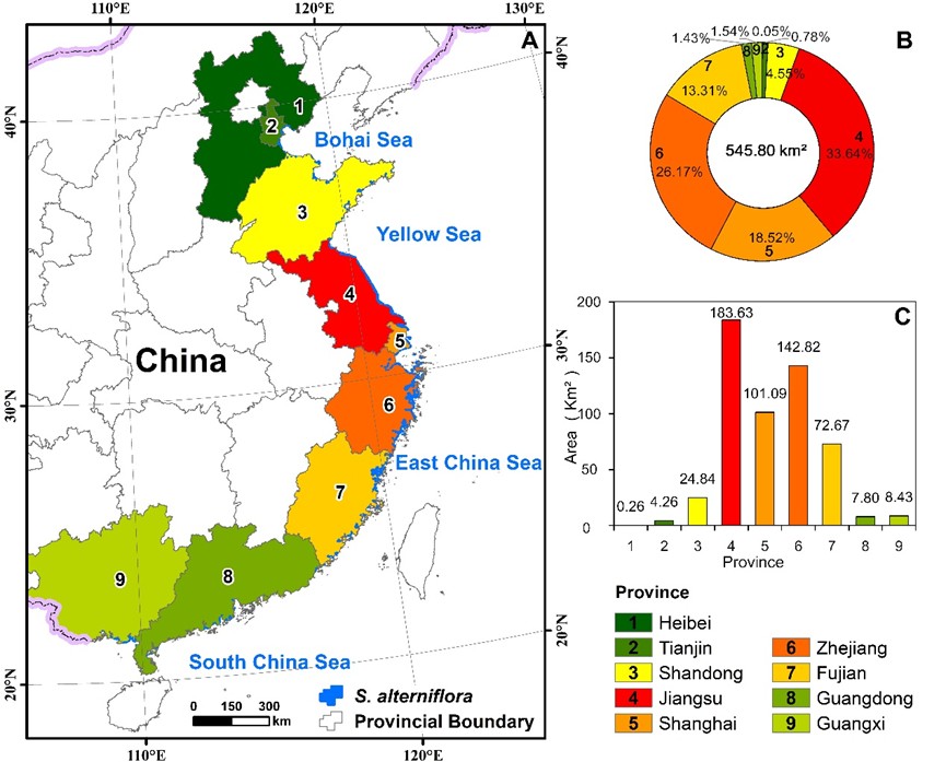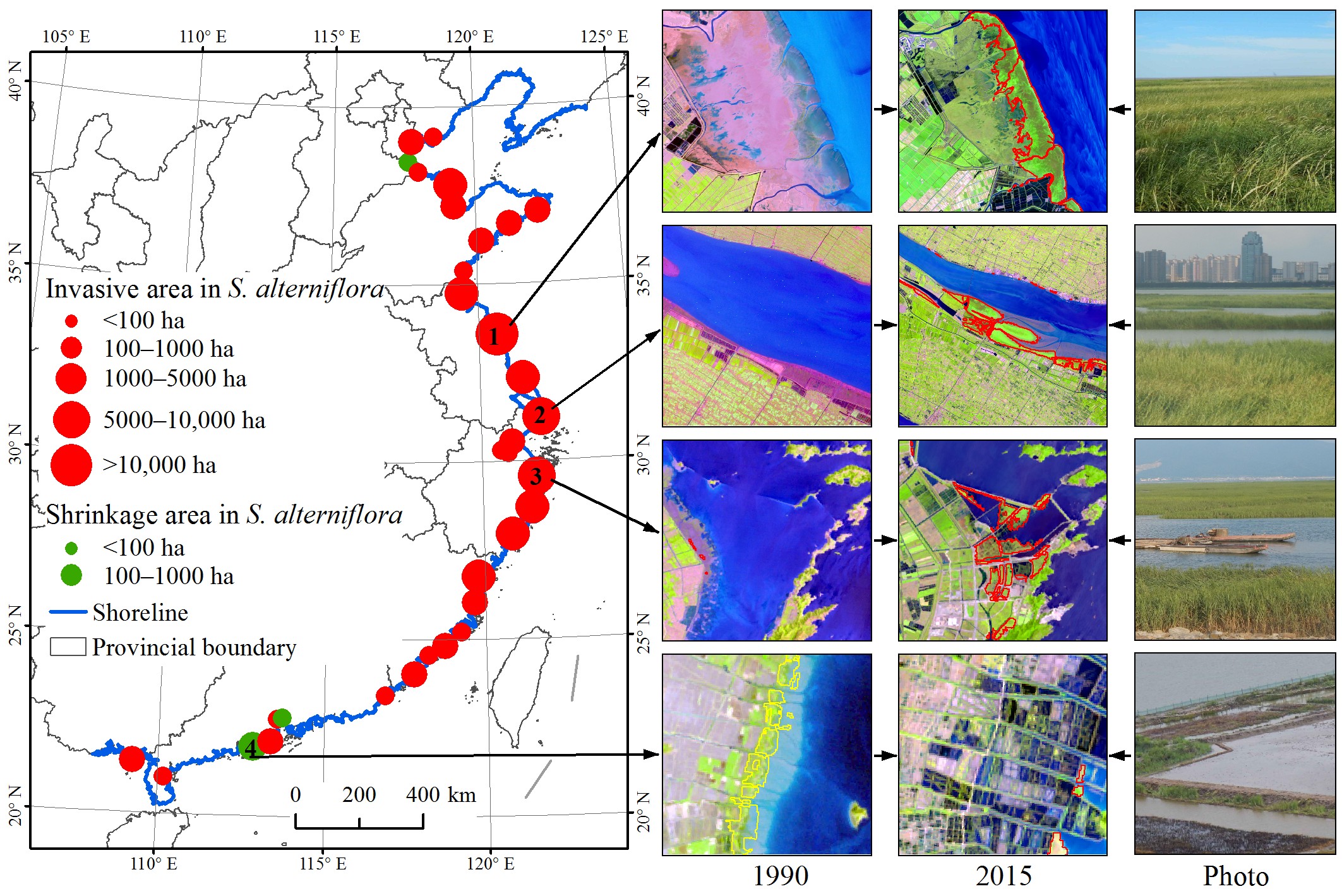 第二次全國(guó)濕地資源調(diào)查表明,外來(lái)物種入侵已成為影響我國(guó)濕地的五大主要威脅因子之一。互花米草原產(chǎn)于北美大西洋沿岸,對(duì)氣候、環(huán)境的適應(yīng)性和耐受能力強(qiáng)。中國(guó)從上世紀(jì)80年代開(kāi)始廣泛引種,用于濱海地區(qū)促淤造陸和保灘護(hù)岸等生態(tài)工程,雖取得了一定的生態(tài)和經(jīng)濟(jì)效益,但造成了較為嚴(yán)重的生態(tài)問(wèn)題,如威脅本土植物群落、入侵灘涂、嚴(yán)重影響水鳥(niǎo)生境等。2003年,國(guó)家環(huán)保部將互花米草列為首批16個(gè)外來(lái)植物入侵物種之一。因此,深入解析中國(guó)濱海地區(qū)互花米草的入侵格局、動(dòng)態(tài)及驅(qū)動(dòng)因素,對(duì)于理解互花米草入侵的演變機(jī)制,支撐濱海濕地可持續(xù)管理與保護(hù),維護(hù)區(qū)域生態(tài)系統(tǒng)安全等具有重要的科學(xué)和現(xiàn)實(shí)意義。
