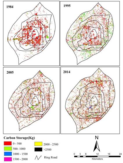 圖 1. 長春市城市森林碳儲量時空分布格局