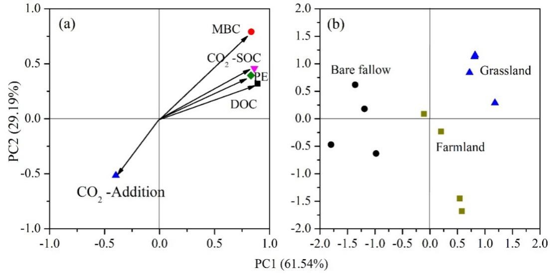 圖1土壤有機(jī)質(zhì)來(lái)源CO2 (CO2-SOC),外源有機(jī)物質(zhì)來(lái)源CO2 (CO2-Addition),激發(fā)效應(yīng)(PE)與土壤活性碳組分(MBC,DOC)的主成分分析