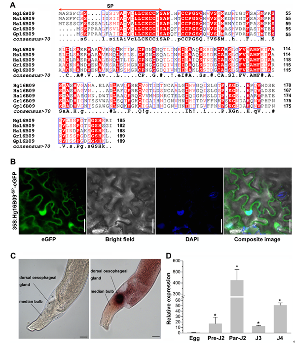 A.Hg16B09序列同源性分析;B. Hg16B09的亞細胞定位;C.Hg16B09組織表達特異性;D. Hg16B09在線蟲不同發(fā)育階段表達特征