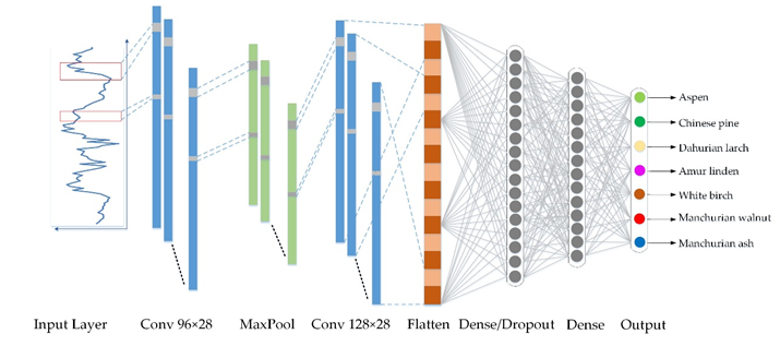 研究人員首次將我國(guó)自主生產(chǎn)的高光譜遙感影像數(shù)據(jù)OHS-1應(yīng)用于優(yōu)勢(shì)樹(shù)種分類研究,發(fā)揮其高光譜分辨率(2.5nm)和高空間分辨率(10m)的優(yōu)勢(shì),同時(shí),引入深度學(xué)習(xí)算法(一維深度卷積神經(jīng)網(wǎng)絡(luò)模型Conv1D),在有限的樣本數(shù)據(jù)條件下,選擇光譜特征和樹(shù)冠紋理特征(熵和均值)作為分類特征參數(shù),通過(guò)優(yōu)化卷積核大小及卷積層數(shù)等參數(shù)的設(shè)置,實(shí)現(xiàn)了東北長(zhǎng)白山典型森林樣區(qū)優(yōu)勢(shì)樹(shù)種的高精度識(shí)別。基于地面調(diào)查樣點(diǎn)的精度驗(yàn)證結(jié)果表明,深度學(xué)習(xí)模型的總體分類精度(85.04%)高于隨機(jī)森林模型(80.61%),尤其是對(duì)于光譜特征相似的闊葉樹(shù)種(如核桃楸和白楊),深度學(xué)習(xí)模型的自動(dòng)識(shí)別精度(87.15%)顯著高于隨機(jī)森林模型(71.77%)。因此,基于卷積的深度學(xué)習(xí)框架結(jié)合高光譜影像數(shù)據(jù)能夠有效提高樹(shù)種分類的準(zhǔn)確性,具有廣闊的應(yīng)用前景。
