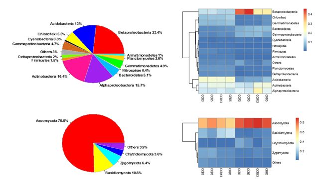 圖1不同處理下細菌與真菌群落組成及聚類分析圖譜