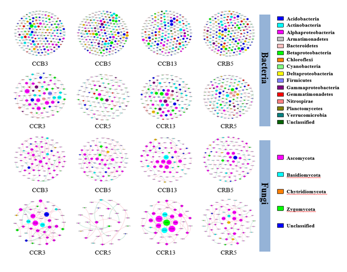 東北地理所農(nóng)田分子生態(tài)學科組基于大豆短期連作(3年和5年)、長期連作(13年)及大豆-玉米輪作等處理,采用高通量測序技術(shù)系統(tǒng)研究了東北區(qū)大豆連作障礙發(fā)生的微生物機制。研究發(fā)現(xiàn),與短期連作相比,長期連作和輪作處理顯著增加了土壤養(yǎng)分含量、細菌和真菌多樣性指數(shù)而降低了土壤真菌與細菌數(shù)量的比值。發(fā)現(xiàn)土壤pH和C:N分別是驅(qū)動大豆連作下土壤細菌和真菌群落發(fā)生演替的主要影響因素。長期連作和輪作處理顯著增加了有益細菌Bradyrhizobiumsp和Gemmatimonassp的相對豐度,而顯著降低了病原真菌Fusariumsp的相對豐度(圖1)。此外,與短期連作相比,長期連作和輪作處理增強了細菌和真菌群落的網(wǎng)絡結(jié)構(gòu)與穩(wěn)定性。輪作處理中具有分解木質(zhì)素和纖維素等有益細菌Bryobacter、Gemmatimonas和Terracidiphilus與真菌群落中具有抑制病原微生物生長的Trichoderma、Mortierella和Exophiala作為主要的關(guān)鍵微生物類群(Module hubs和Connectors),可能對改善土壤環(huán)境具有積極的作用(圖2)。總體而言,大豆長期連作處理在微生物數(shù)量、多樣性指數(shù)及群落結(jié)構(gòu)組成與短期連作處理差異顯著,但與輪作處理相似,說明大豆長期連作導致了土壤產(chǎn)生“抑病土”的微生物基礎(chǔ)。