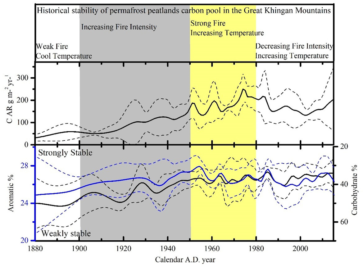 19世紀(jì)末以來,大興安嶺地區(qū)人類活動(dòng)日益加劇,人類活動(dòng)引起的野火頻發(fā)不僅促使泥炭沼澤植被的生長(zhǎng),提高碳累積速率;由于野火頻發(fā)促使表層土壤中易分解的有機(jī)物快速分解且產(chǎn)生含有芳香族結(jié)構(gòu)的熱解碳,因此野火頻發(fā)也提高泥炭沼澤土壤碳庫(kù)中芳香族化合物的含量,進(jìn)而增加土壤碳庫(kù)的穩(wěn)定性。因此在1900-1980年間,野火頻發(fā)促使大興安嶺北部地區(qū)泥炭沼澤土壤碳庫(kù)的累積速率和穩(wěn)定性均明顯增加。大興安嶺北部野火發(fā)生的頻率和強(qiáng)度在20世紀(jì)80年代以來開始明顯下降,泥炭沼澤土壤碳庫(kù)的累積速率和穩(wěn)定性也隨之開始下降。氣候變化逐漸成為影響泥炭沼澤土壤碳庫(kù)的主要因素,從2000年至今,氣溫升高和降水減少導(dǎo)致大興安嶺地區(qū)北部泥炭沼澤土壤碳庫(kù)的累積速率和穩(wěn)定性均出現(xiàn)增加的趨勢(shì)。本研究首次論述了近百年來氣候變化、野火頻發(fā)等環(huán)境擾動(dòng)因素對(duì)泥炭沼澤土壤碳庫(kù)穩(wěn)定性的影響,同時(shí)研究結(jié)果將為評(píng)估和預(yù)測(cè)未來全球變化對(duì)泥炭沼澤土壤碳庫(kù)的影響具有重要的意義。