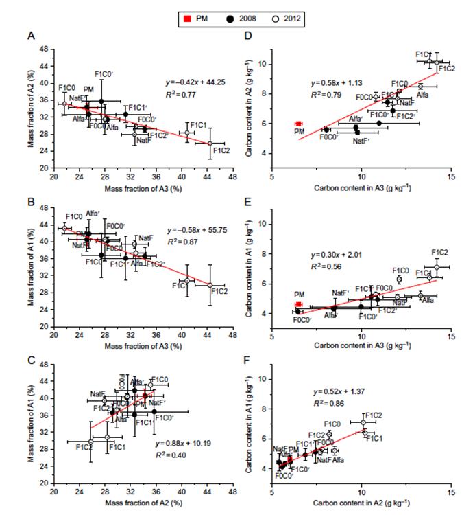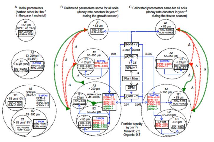 東北地理所土壤物質(zhì)循環(huán)學科組基于黑龍江海倫農(nóng)田生態(tài)系統(tǒng)國家野外科學觀測研究站內(nèi)的黑土母質(zhì)熟化定位試驗,通過土壤團聚體分級、閉蓄態(tài)微團聚體分離和13C-核磁共振技術(shù),1)區(qū)分了夏季和冬季土壤不同組分碳的腐解和轉(zhuǎn)化速率參數(shù),建立了黑土母質(zhì)熟化過程中土壤有機質(zhì)、土壤結(jié)構(gòu)和土壤團聚過程的CAST模型,并以2年實測試驗數(shù)據(jù)進行校準,成功預(yù)測了黑土母質(zhì)在熟化初期土壤有機質(zhì)和團聚體耦合動態(tài)變化過程,發(fā)現(xiàn)母質(zhì)在熟化初期,多年生自然植被恢復(fù)和農(nóng)田化肥加秸稈還田措施使土壤中> 0.25 mm的大團聚體比例增加,特別是其內(nèi)顆粒有機質(zhì)含量增加顯著,而0.053–0.25mm的微團聚體和< 0.053 mm的粉黏粒比例減少;2)初步描述了母質(zhì)熟化初期土壤的團聚化過程及控制因子。土壤初級團聚化過程首先發(fā)生于植物腐解形成的有機質(zhì)碎片周圍,有機碎片被黏粒包裹不斷形成閉蓄態(tài)組分,閉蓄態(tài)組分不斷分解,包裹于其外的初級大團聚體不斷形成。初級大團聚體繼續(xù)分解破碎,又形成次級微團聚體、大團聚體和粉黏粒。該初級團聚化過程更多受母質(zhì)屬性影響,而受田間施化肥和秸稈等有機物質(zhì)還田量的影響很小。而農(nóng)田管理措施通過改變有機質(zhì)在不同粒徑團聚體中的轉(zhuǎn)運效率,影響土壤的次級團聚化過程,進而影響土壤團聚體周轉(zhuǎn)及其內(nèi)部保護的土壤有機質(zhì)的穩(wěn)定化過程;3)進一步揭示了團聚體內(nèi)部有機碳組分的化學結(jié)構(gòu)和穩(wěn)定性機制,發(fā)現(xiàn)外源碳經(jīng)過一系列的分解和轉(zhuǎn)化,更多的被固存在微團聚體內(nèi)的粉黏粒組分中,主要以烷基碳、芳香族碳和羰基碳為主,這部分碳受土壤團聚體的物理化學保護作用較大,且更多來源于微生物活動的代謝產(chǎn)物,有機質(zhì)的穩(wěn)定化程度較高。而在較大粒徑的大團聚體或粗顆粒有機質(zhì)中,來源于植物殘體的烷氧基比例更多,其活性和微生物可利用性更高,更容易被微生物和植物分解利用。研究結(jié)果對于揭示土壤有機質(zhì)與團聚體的耦合作用機制、正確評價退化黑土的肥力快速恢復(fù)過程及有機質(zhì)穩(wěn)定性機制具有重要意義。