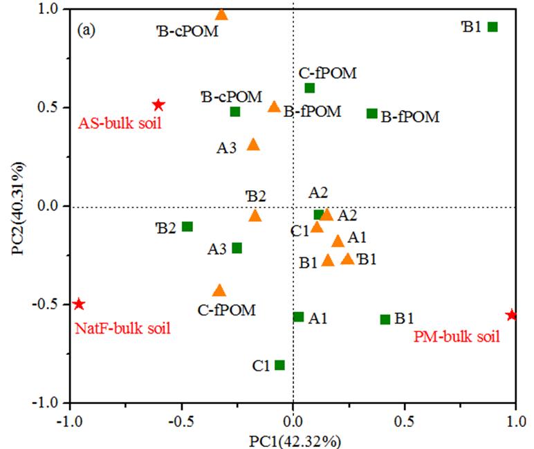 圖3 母質(zhì)發(fā)育初期表層土壤不同粒徑團聚體內(nèi)有機碳化學組成主成分分析圖