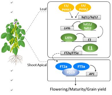 圖1 大豆光周期開花和產(chǎn)量形成的分子模式圖 圖2 大豆適應(yīng)熱帶短日照地區(qū)的模式圖