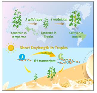 我所曾于2017年在Nature Genetics上先期報道了大豆長童期基因J的克隆及進(jìn)化機(jī)制研究成果“Natural variation at the soybean J locus improves adaptation to the tropics and enhances yield”。發(fā)現(xiàn)J基因功能缺失使大豆在短日照條件下仍能保持相對較長的營養(yǎng)生長,獲得高產(chǎn),使大豆種植在低緯度(尤其是南美地區(qū))得以快速擴(kuò)張,改變了世界大豆生產(chǎn)格局(圖2)。兩篇文章相互補(bǔ)充,為大豆品種適應(yīng)性和產(chǎn)量分子育種提供了重要的理論依據(jù)和應(yīng)用基礎(chǔ)。