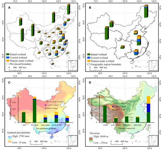 研究結(jié)果表明,2015年中國(guó)濕地面積為45.1萬(wàn)km2,其中70.5%的濕地是內(nèi)陸濕地;14個(gè)濕地二級(jí)類中內(nèi)陸草本沼澤面積最大,為15.2萬(wàn)km2。在大的地理分區(qū)、省域、不同降水梯度、不同高程梯度上的對(duì)比分析發(fā)現(xiàn),中國(guó)濕地分布的空間異質(zhì)性明顯。